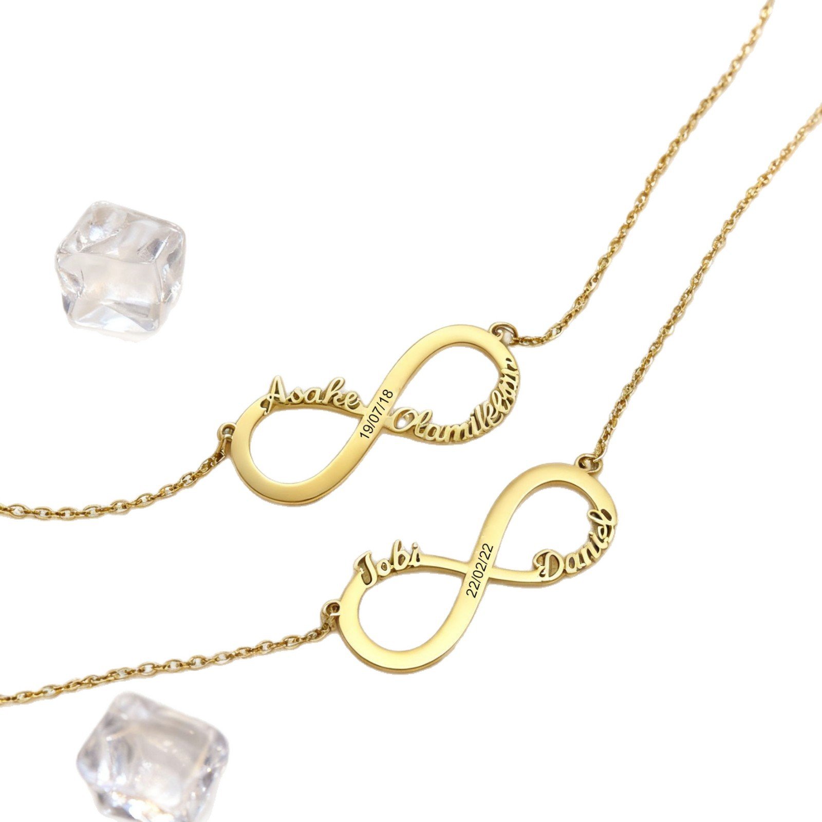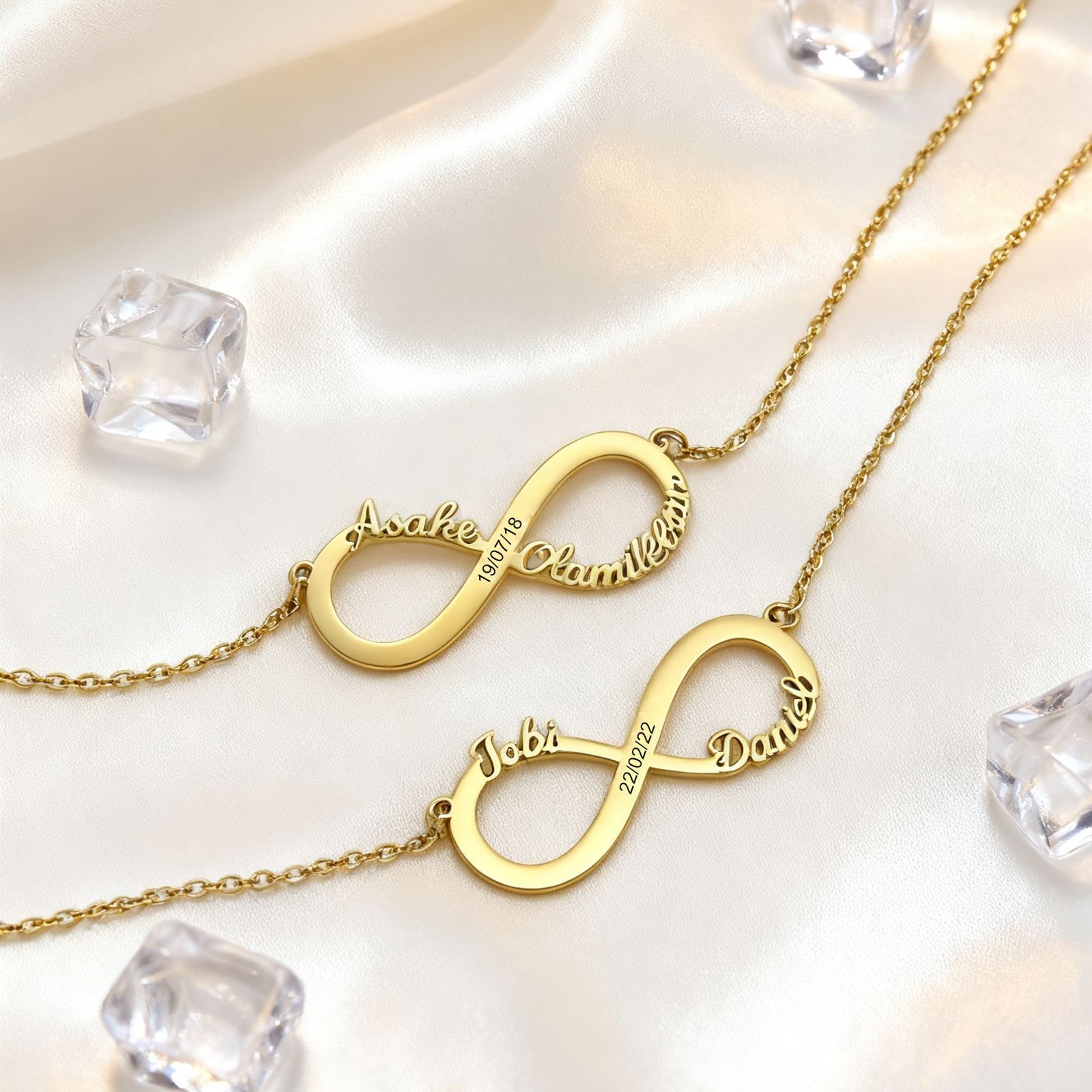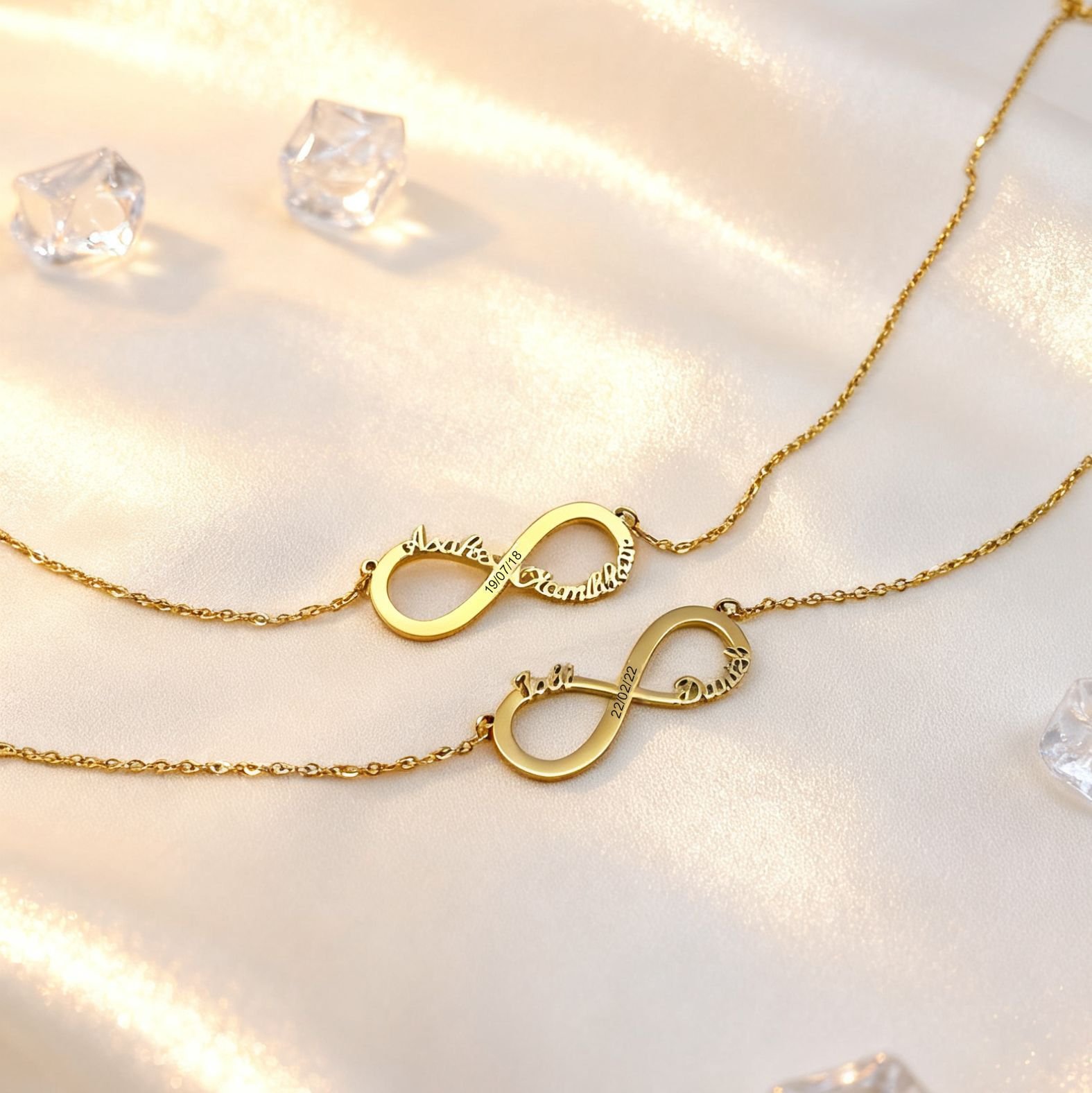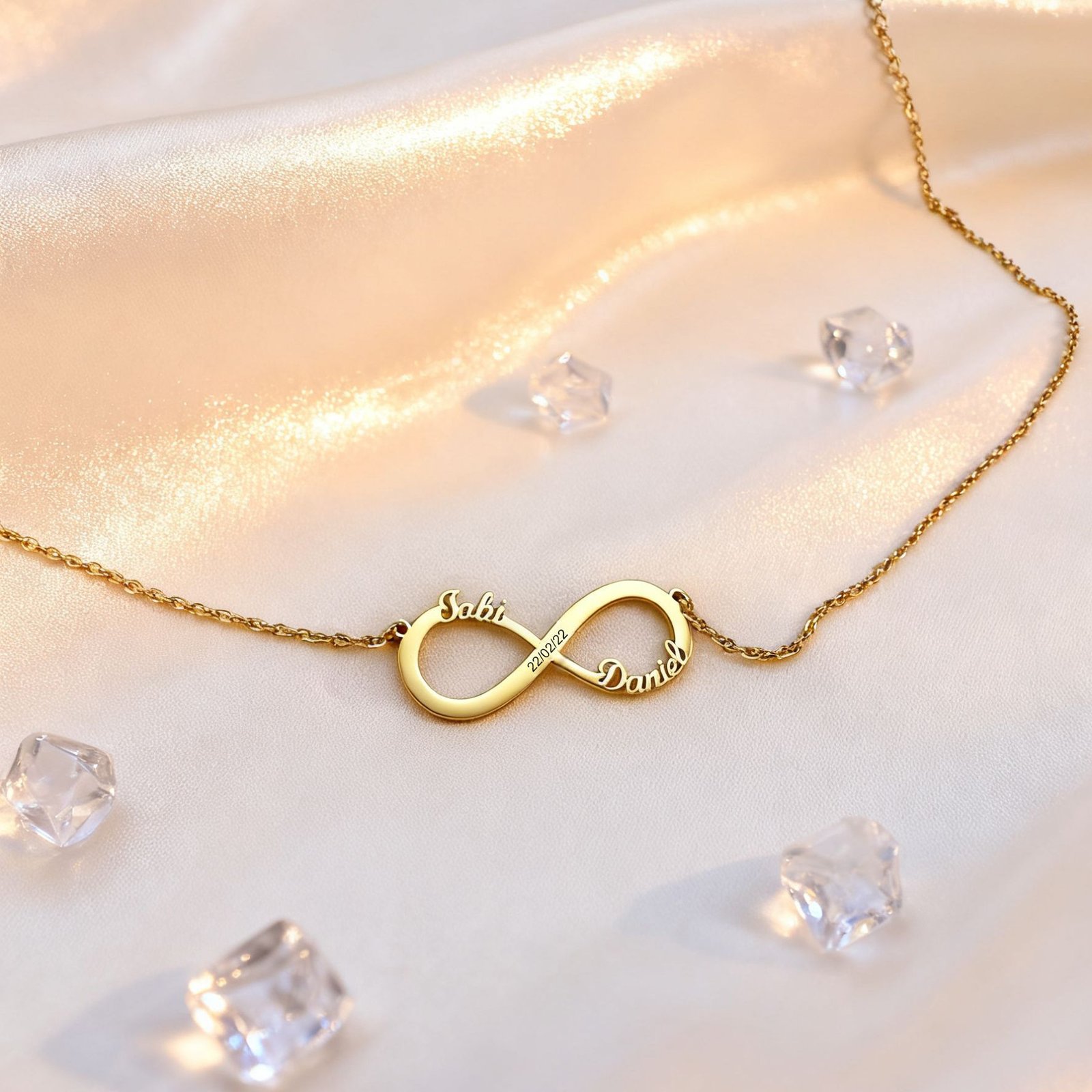 “Love that lasts forever deserves a symbol as timeless as your bond. Our Personalized Infinity Necklace​ lets you etch names, dates, or a secret message into a delicate gold-plated infinity—because some connections are truly endless.”